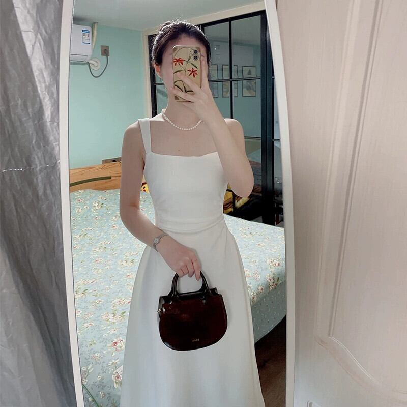 フレンチスタイルの逃亡王女の白いサスペンダードレスは、細くて高品質に見える女性のハイエンドウエストAラインドレスです ホワイト yingd91690820077