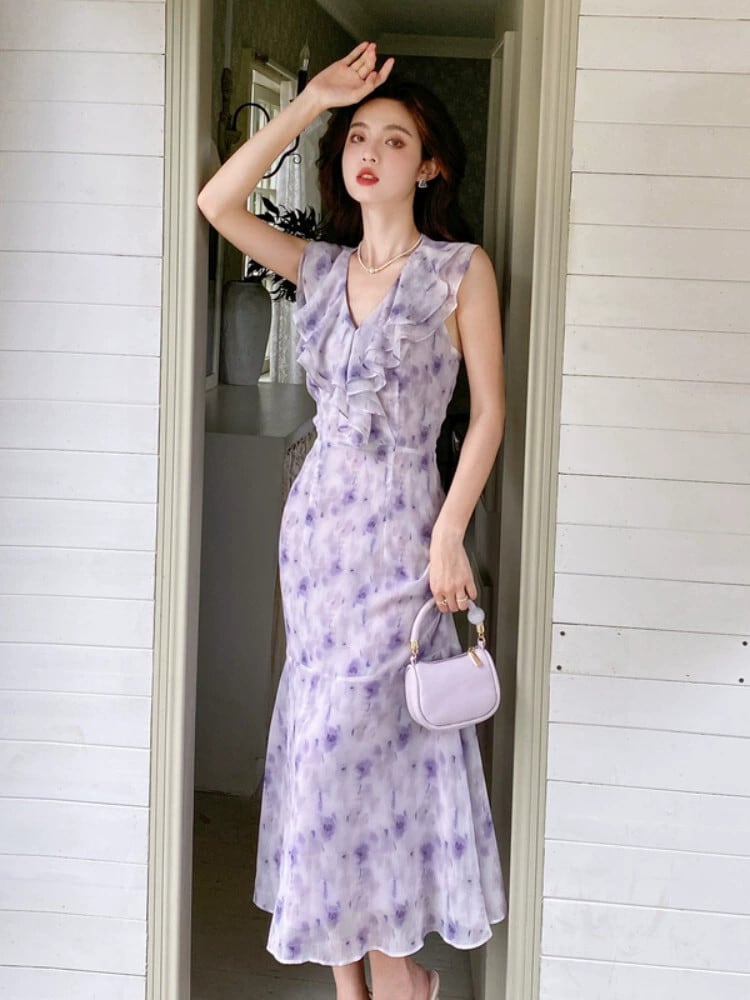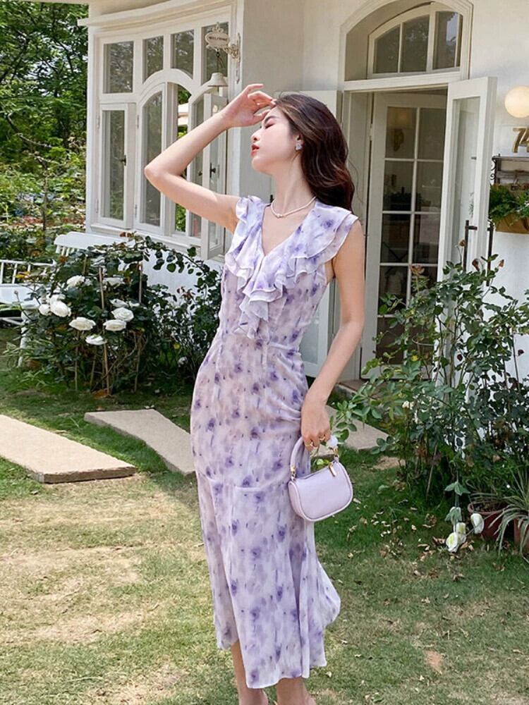 ティーブレイクフレンチシックで美しいレトロスカートテクスチャ高品質の気質女神ファンブロークンフラワーホルターネックドレス女性 フラワーデザイン yingd56280393591