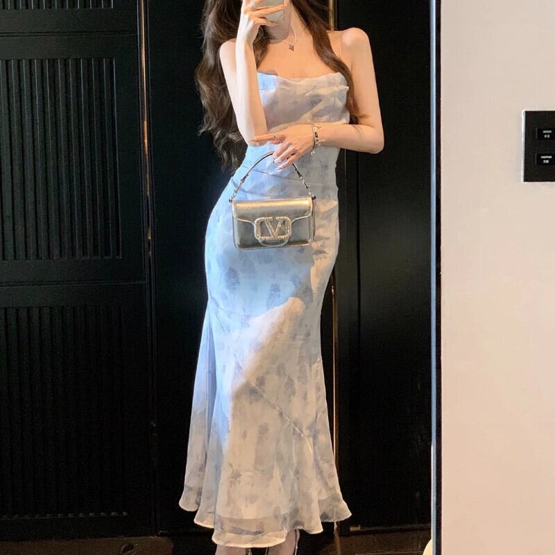 ティーブレイクフレンチフローラルスリングドレスニッチデザインスイングカラーセクシーなオープンバックハイエンド絶妙なドレス女性の夏 サマー 夏物 花柄 yingd53470751229