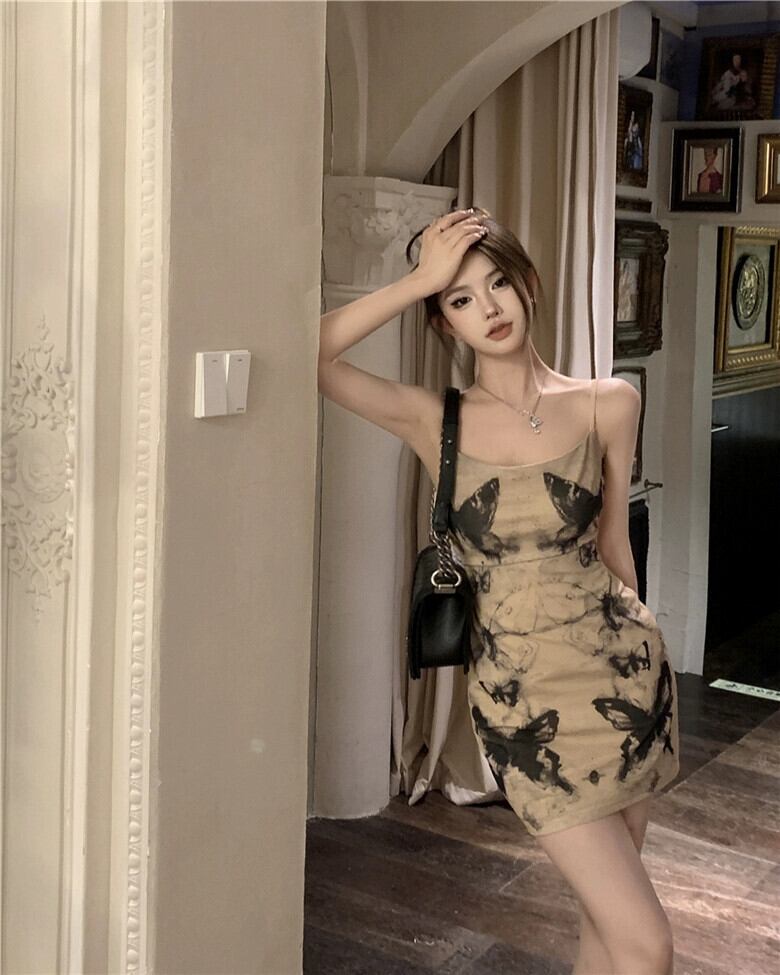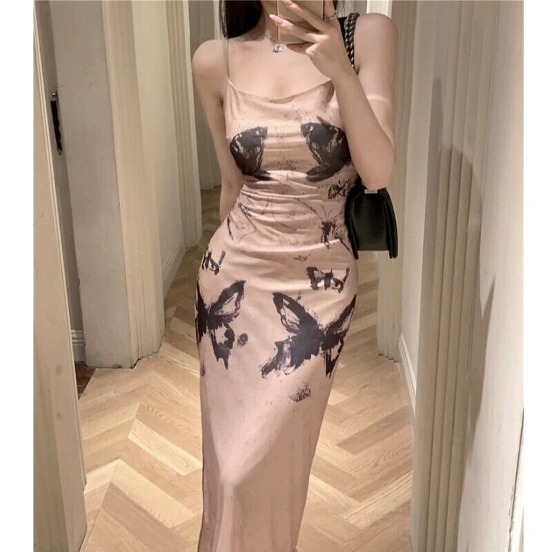 シックで美しいレトロなスカートの質感の高品質ウエスト絞り染めプリントサスペンダードレス 2023 新しい女性の夏 サマー 夏物 yingd22685484999