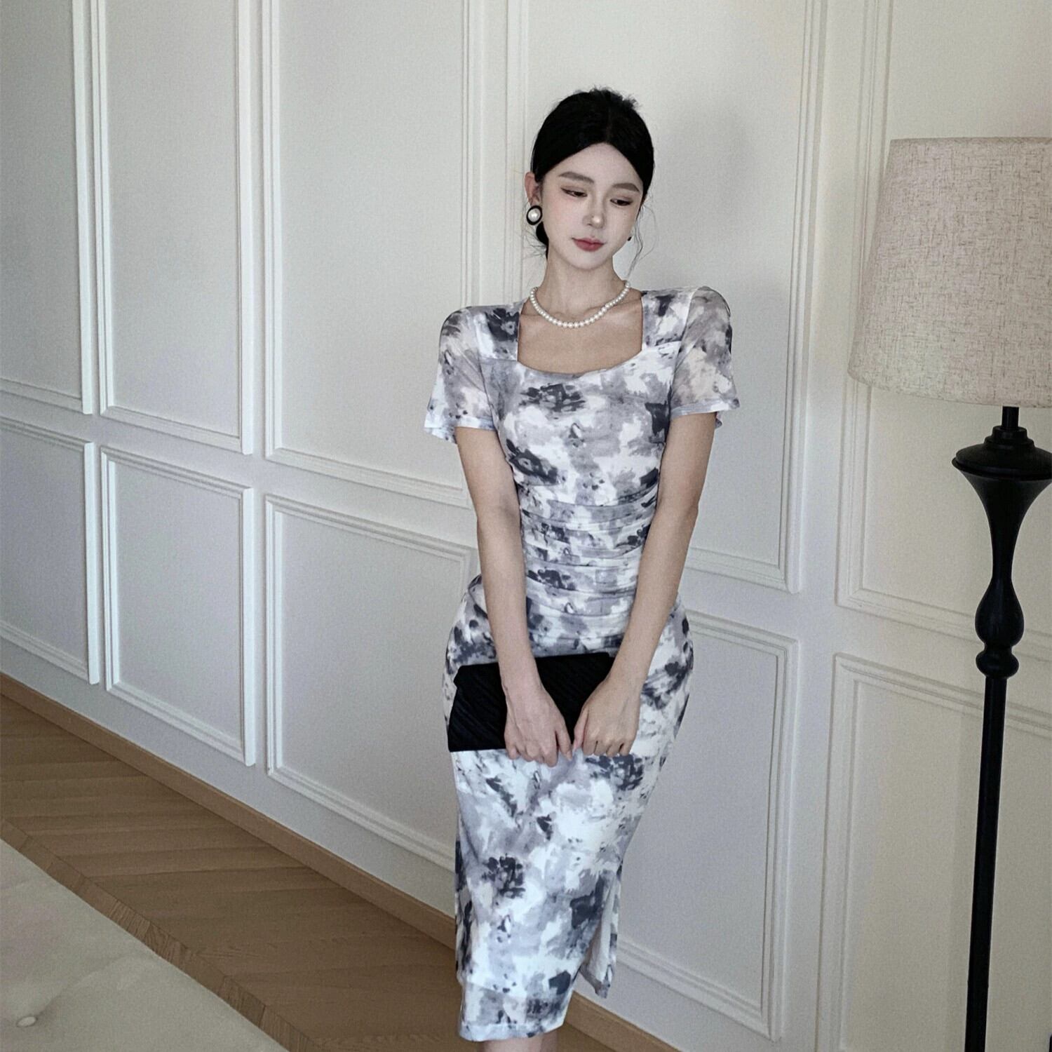 ティーブレイクフレンチスタイルスクエアネックネットガーゼプリントウエストプリーツ気質ロングスカートスリムスリットハイエンドライト高級ドレス女性 スクウェア yingd10790010298