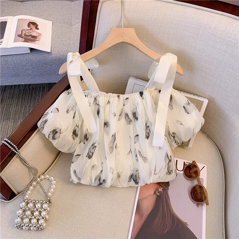 シックで美しいワンショルダートップハイエンドファッションエインスタイル年齢を軽減するパフスリーブオフショルダー花柄キャミソールシャツ女性 yingd43135977947