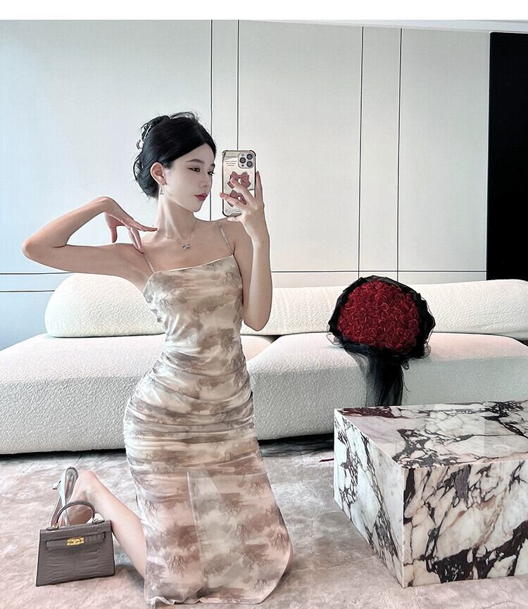 2023 新しい女性の夏のハイエンドライト高級気質セレブサスペンダースカートメッシュプリントスリムフィットバッグヒップサスペンダードレス サマー 夏物 yingd20885204125