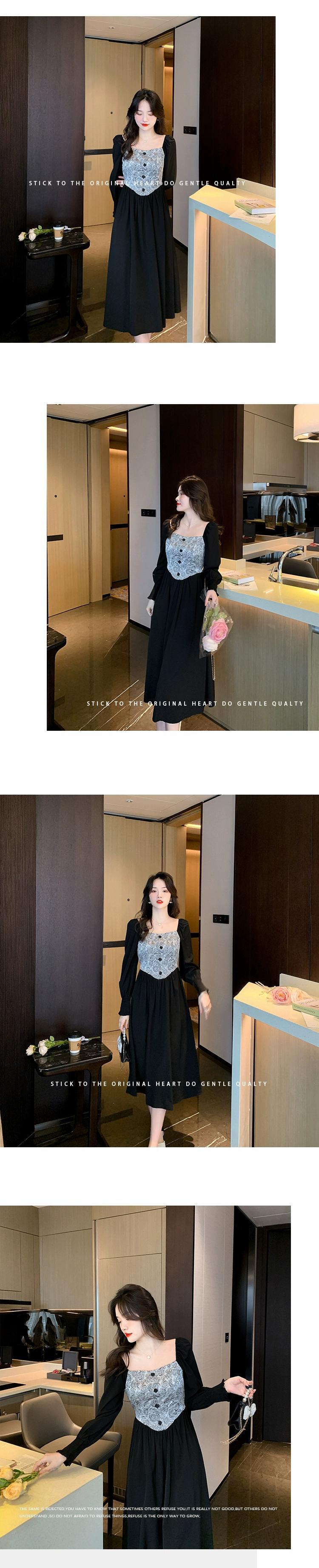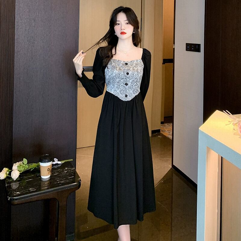 秋の女性の2023新しいスタイルのシックでユニークなスプライシングスクエアカラーのハイエンドで超美しい長袖ドレープドレス ロング オータム 秋物 スクウェア yingd96455537285