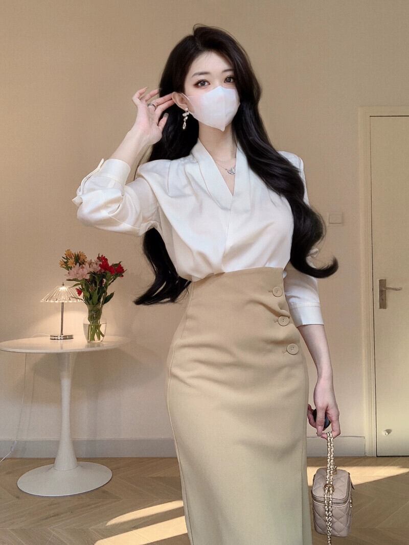 初秋衣装セット 2023 新作レディース高級サテン V ネックシャツヒップカバースカート 2 点セット オータム 秋物 Vネック yingd91960945163