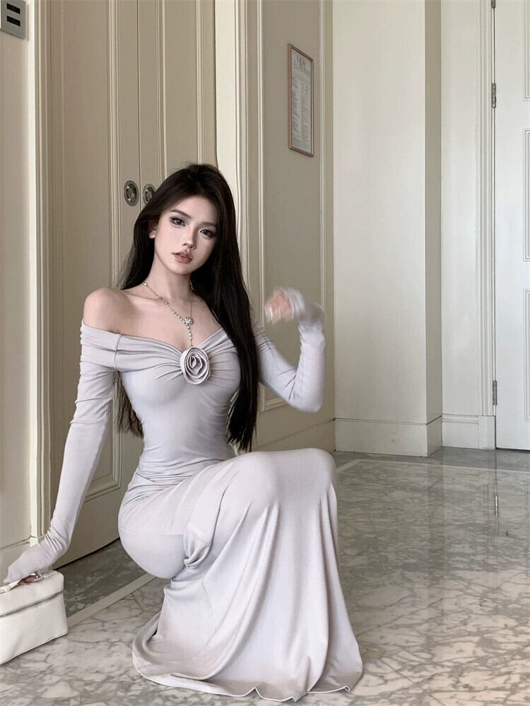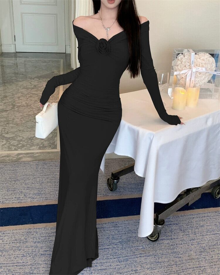ワンショルダー、フェミニンでセクシーなロングドレス、秋スタイル、ハイコール、ロイヤルシスタースタイル、スリムフィット、ボディ見せドレープドレス オータム 秋物 yingd18232115558