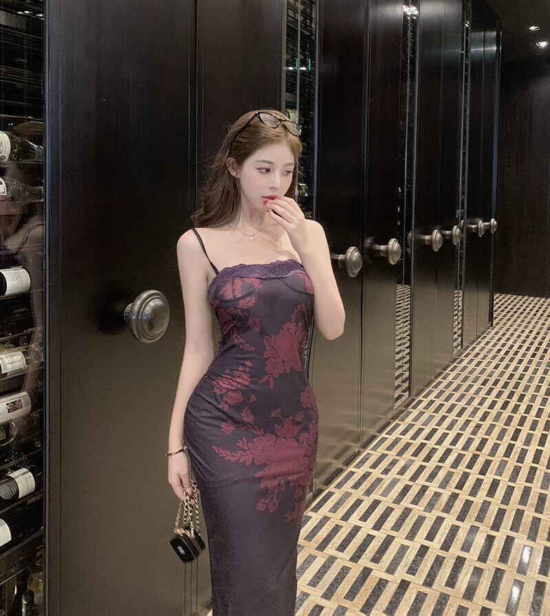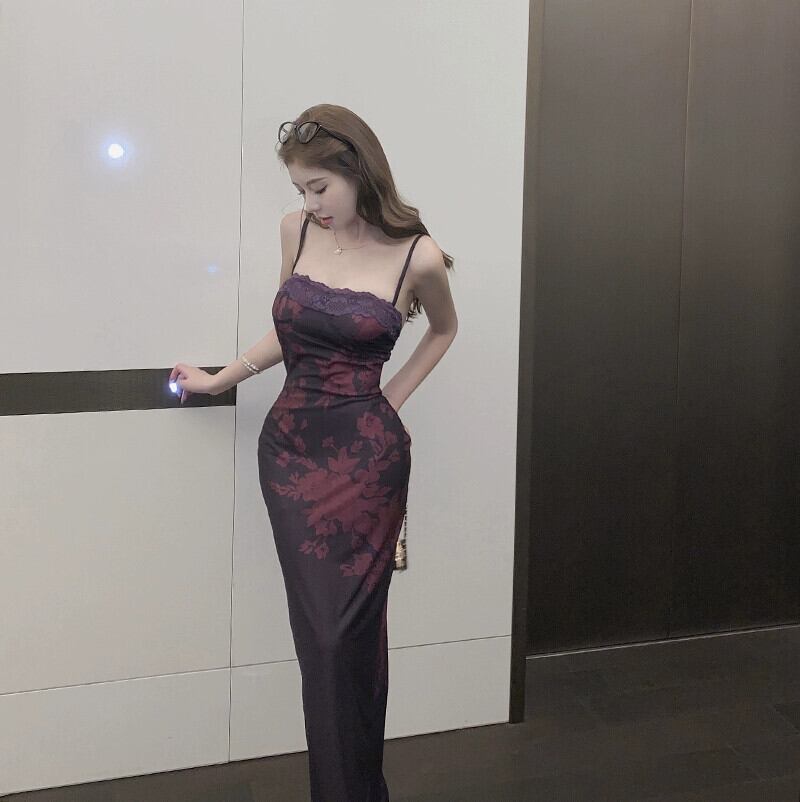 中国風レトロプリントスリムフィットお尻カバーセクシーなレースサスペンダーロングスカート表示図スーパードレス女性 yingd63971274479