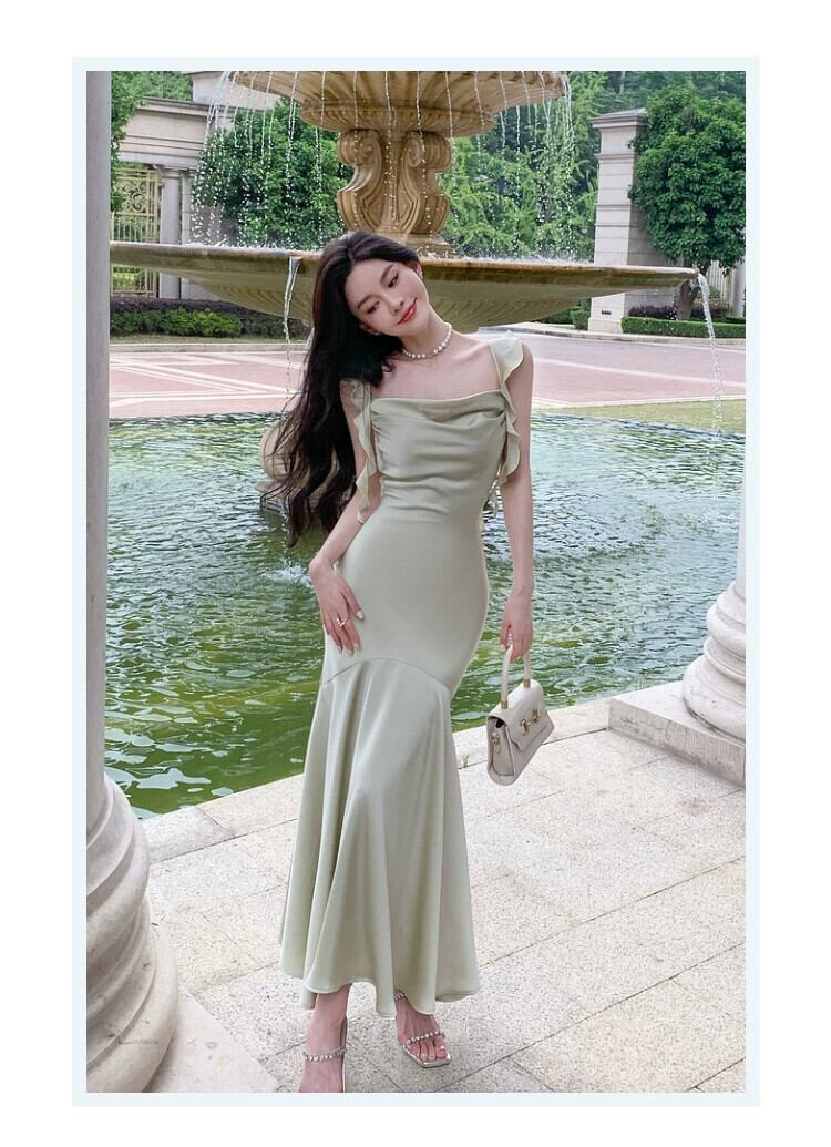 Yujieの軽くて大人なスタイルの高級サテンフィッシュテールロングドレスは、ウエストを絞って細く見えます。シックで個性的なドレスがとても素敵です。 yingd22578918041