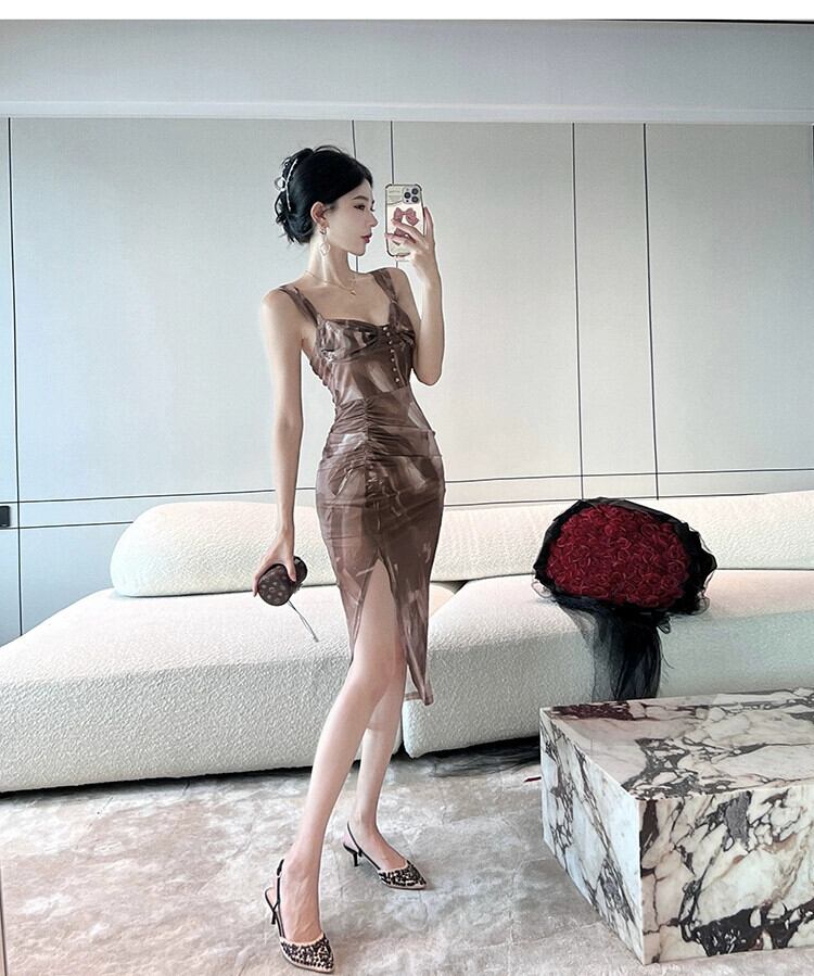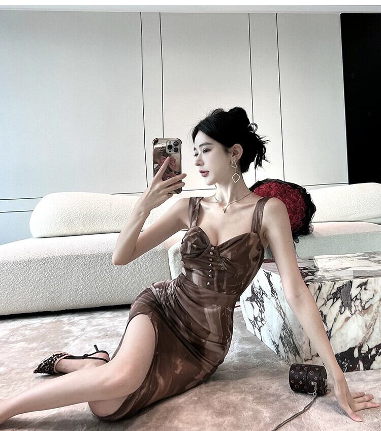ドレス、ハイエンドの軽い贅沢、ニッチなデザイン、メッシュプリント、スリムフィット、スリットサスペンダードレス、淑やかな気質 yingd16479691280