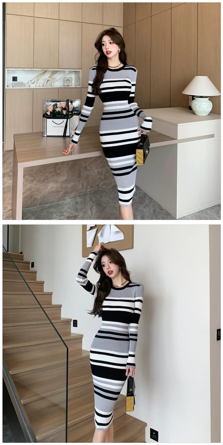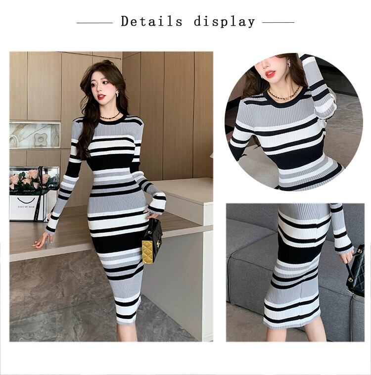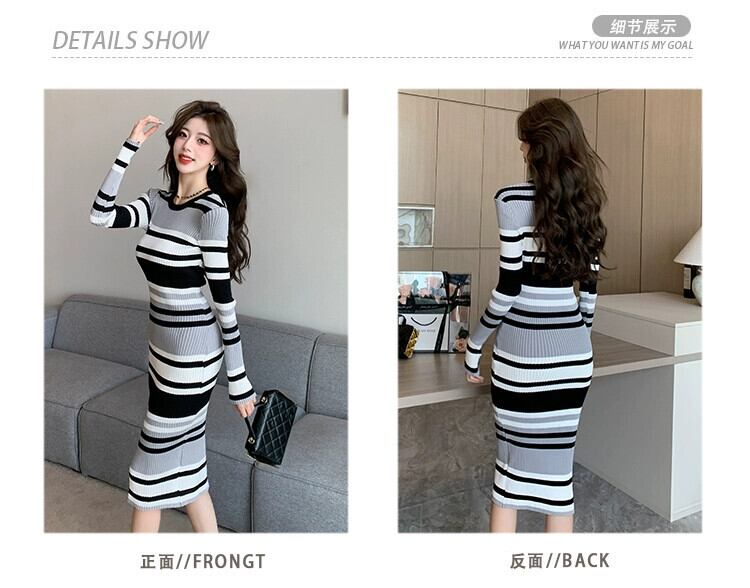 初秋のニットドレスと下にコート、秋服女性 2023 新しいスタイルスリム膝丈ストライプセータードレスロング オータム 秋物 yingd88090250614