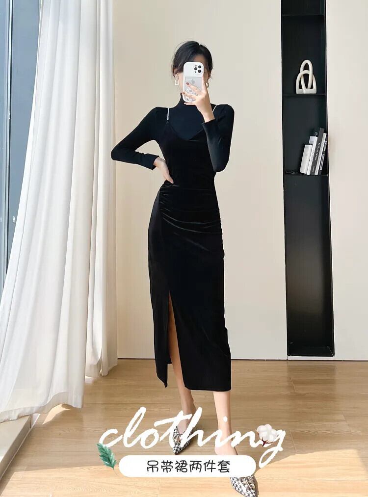 今年のトレンドの美しいスカートはハイエンドでユニークでとてもかわいい、レトロなベルベットサスペンダードレス2点セット秋冬です オータム 秋物 ウィンター 冬物 yingd64654042523