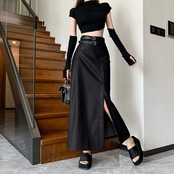 -ウエストロングスリムレザースカート2023新作レディース秋スタイルハイエンドAラインスリットロングスカートスカート オータム 秋物 yingd26173743973
