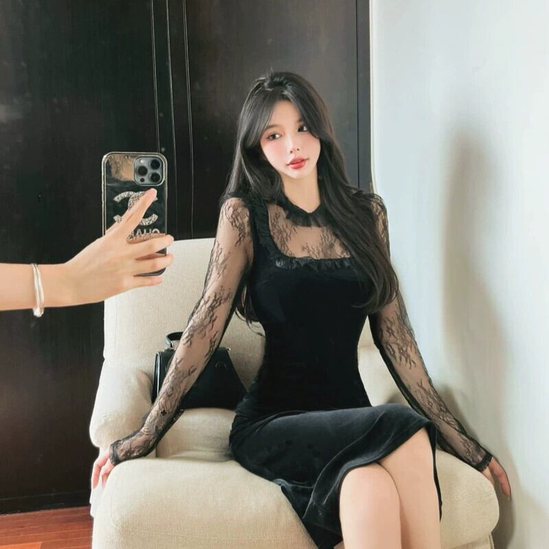 秋の摩耗ハイエンドフレンチスタイルの美しいレーススプライシングデザインハイエンドの絶妙なレトロなベルベットのドレスの女性 オータム 秋物 yingd36078205869
