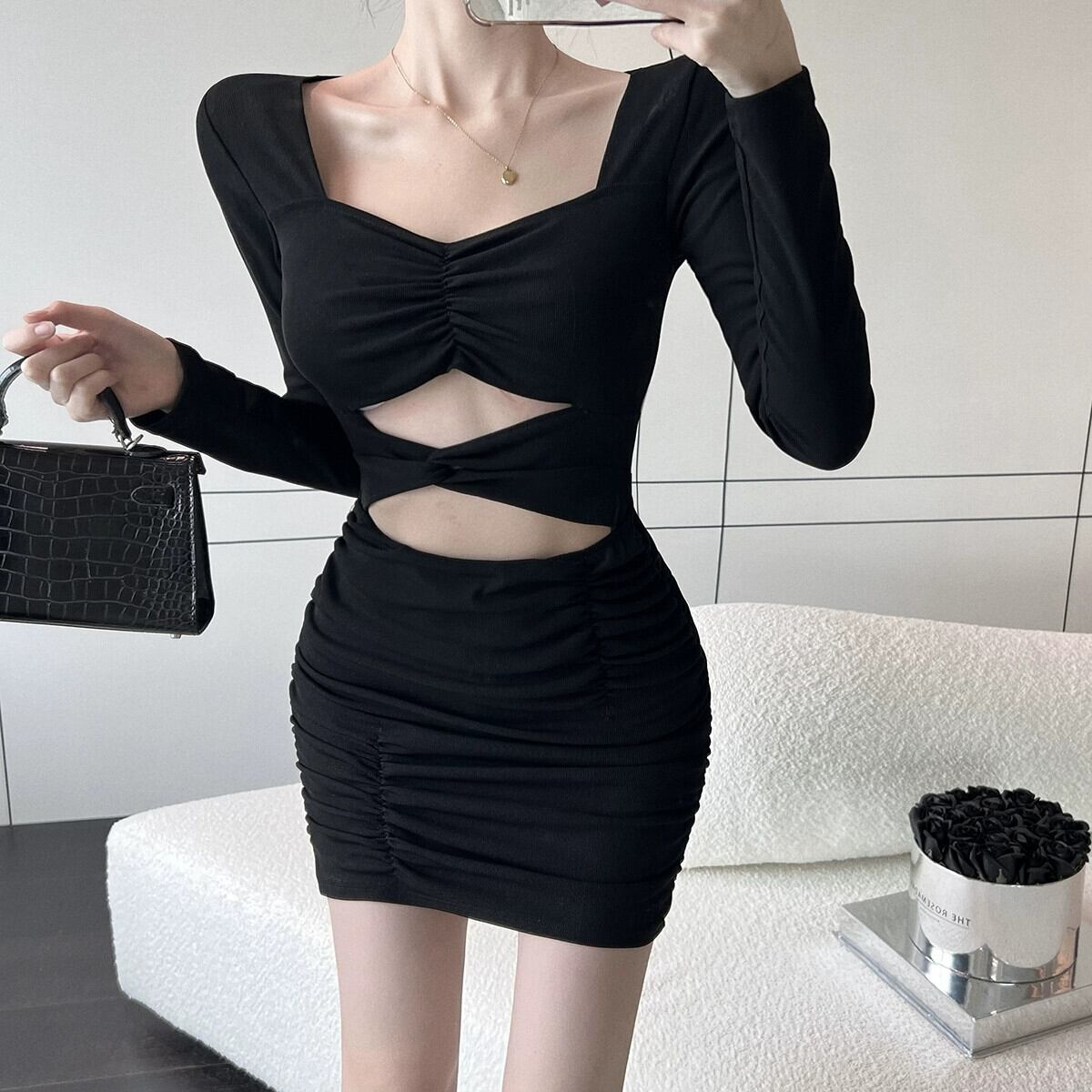 今年人気のきれいめスカートは高級感のある素材感で、驚くほど美しいスカートです。秋のセクシーな中空ヒップカバー長袖ドレス女性。 ロング オータム 秋物 yingd70753255047