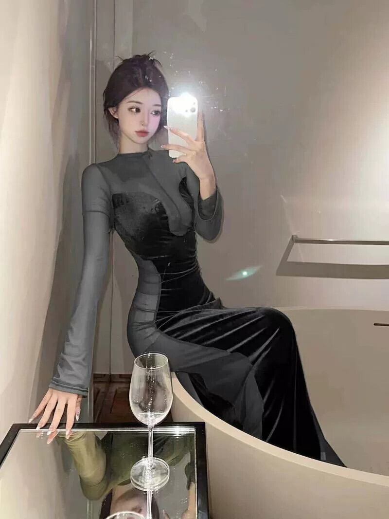 ヨーロッパとアメリカのスカート、セクシーなデザイン、ニッチスプライシング、メッシュ、ハイコールド、ロイヤルシスタースタイル、ドレープドレス、ロングスカート ヨーロピアン yingd320795000