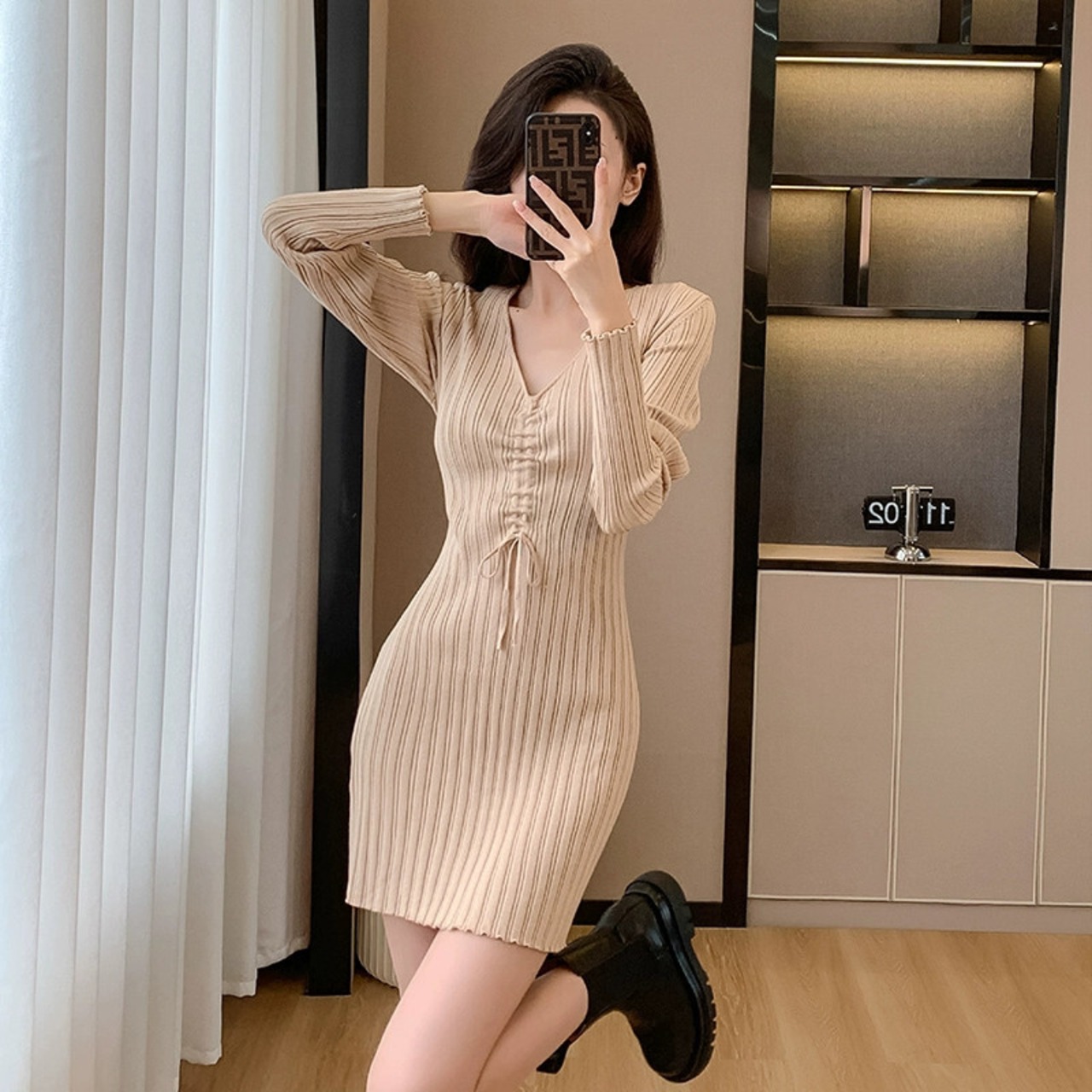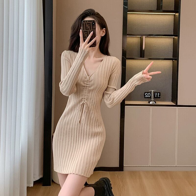 秋の服装-エンドスモールスリムフィットヒップハグセータードレスセクシーなVネック長袖ニットドレス2023 ロング オータム 秋物 yingd83921950012