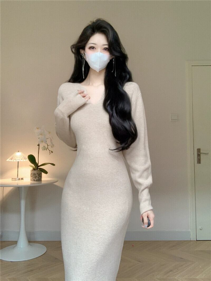 女神スタイルのハイエンドセータードレスの女性の秋と冬のミッドレングスウエスト痩身長袖ミニマリストニットドレス ロング オータム 秋物 ウィンター 冬物 yingd72804276438
