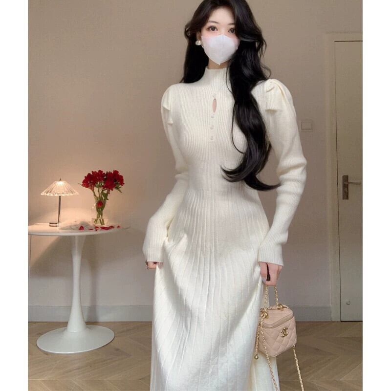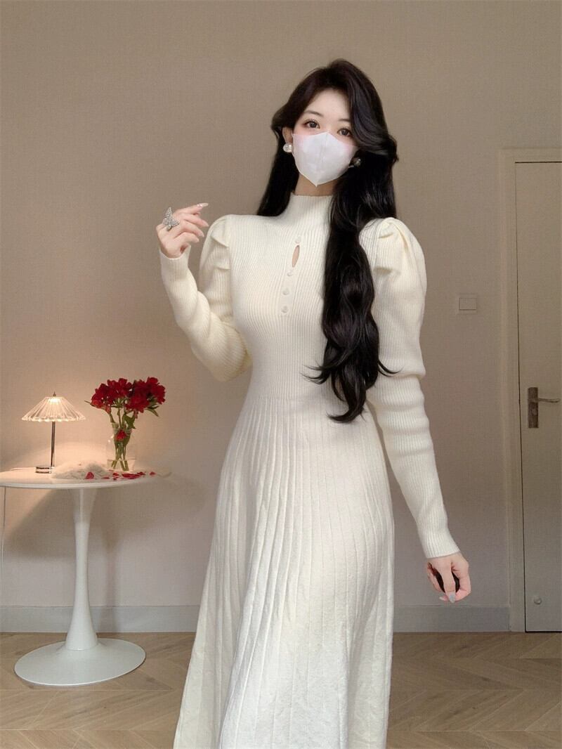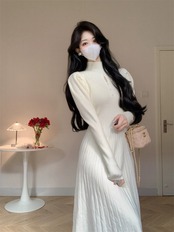 ハーフタートルネック、コートとセータードレス、ロング膝丈のスリムフィットボトムニットドレス、秋冬 オータム 秋物 ウィンター 冬物 yingd94325656339