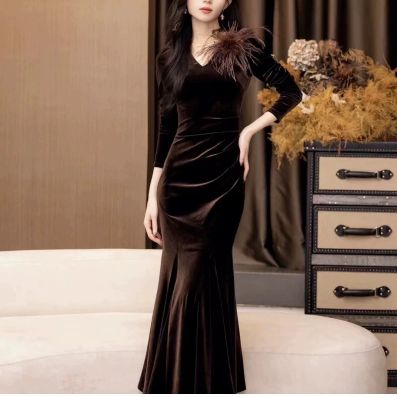 フランスのレトロなヘップバーンスタイルのスリムフィットヒップ抱きフィッシュテールロングスカート、ハイエンドで非常に見栄えの良いベルベットのドレスの女性の秋と冬の女性 オータム 秋物 ウィンター 冬物 yingd29252237069