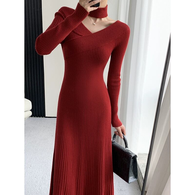 秋と冬の新しいスタイルのスリムウエストのVネックハイエンド長袖ニットドレスと膝上のボトムセータースカート付きコート ロング オータム 秋物 ウィンター 冬物 yingd91079759570