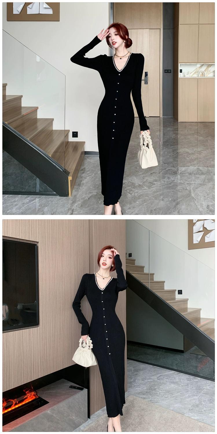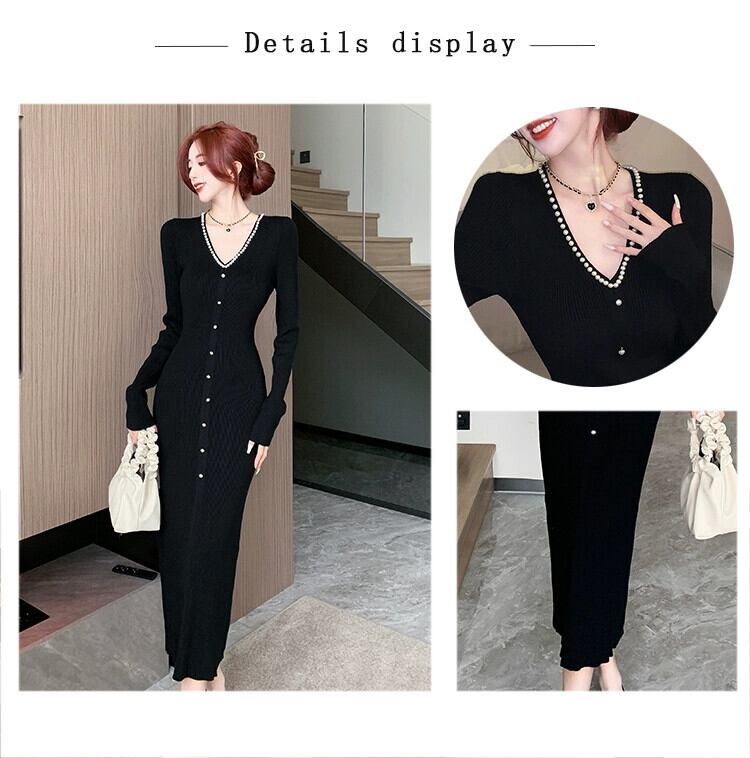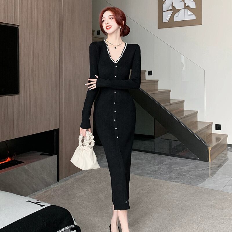 フレンチレトロヘップバーンスタイルロングスカート、ハイエンドでエレガント、社交界のリトルブラックスカート、ビーズニットドレス、女性の秋と冬 オータム 秋物 ウィンター 冬物 yingd63214814974