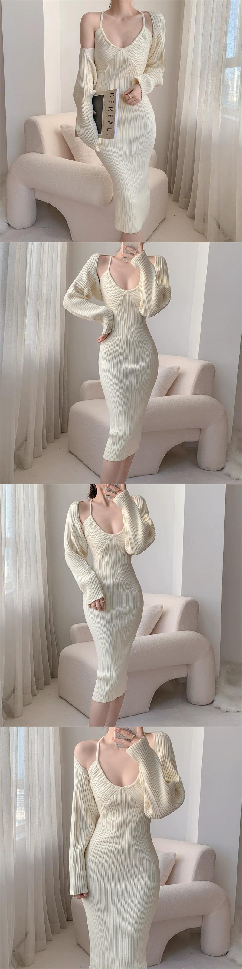 ホットセクシーなスリムロングサスペンダーホルタードレスニットカーディガン長袖ショールツーピーススーツ秋 オータム 秋物 yingd73319118669