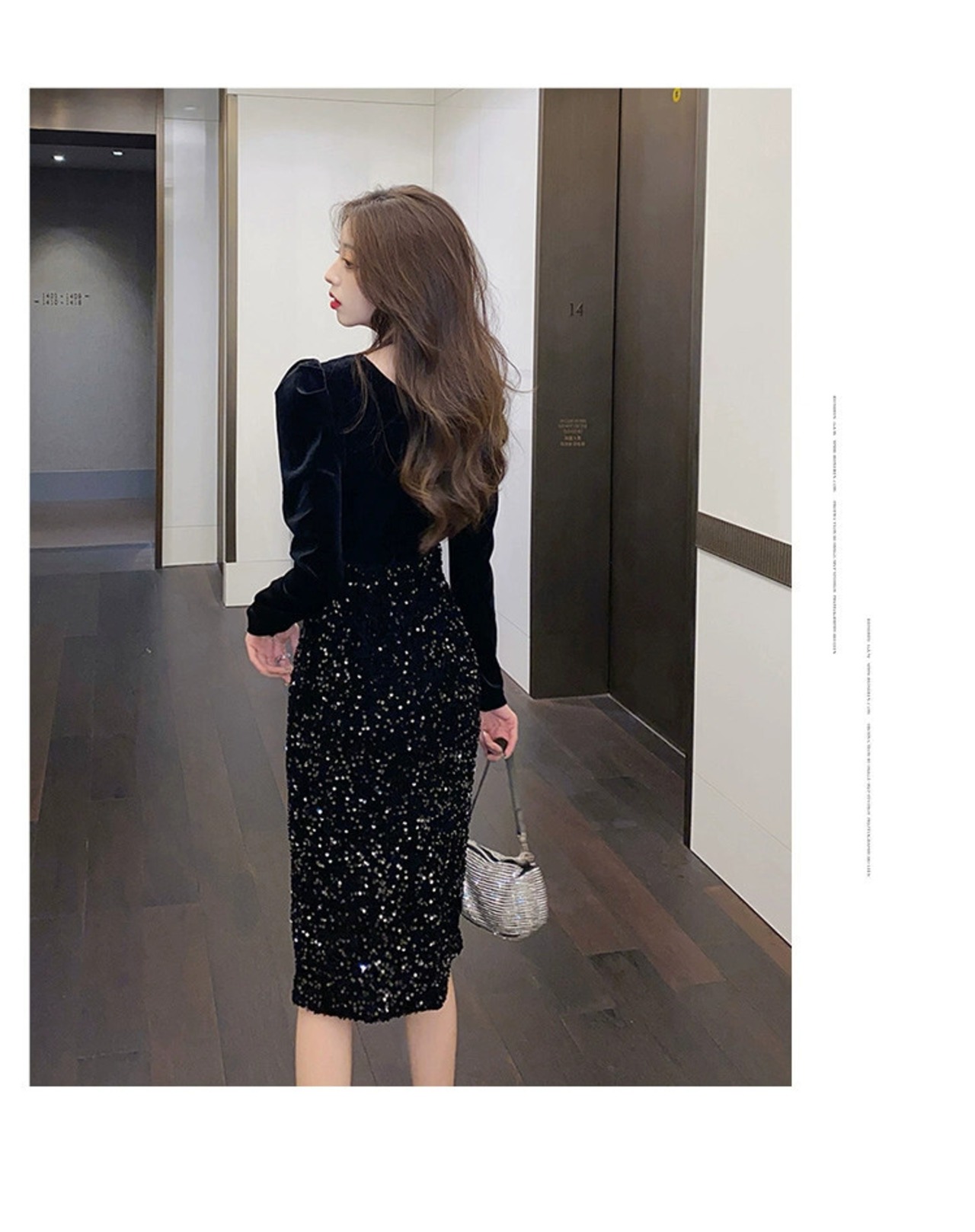 秋冬フレンチハイエンドヘボンスタイルVネックパフスリーブ長袖ベルベットドレスウエストカバーヒップミニスカート女性 ロング オータム 秋物 ウィンター 冬物 yingd68389329850