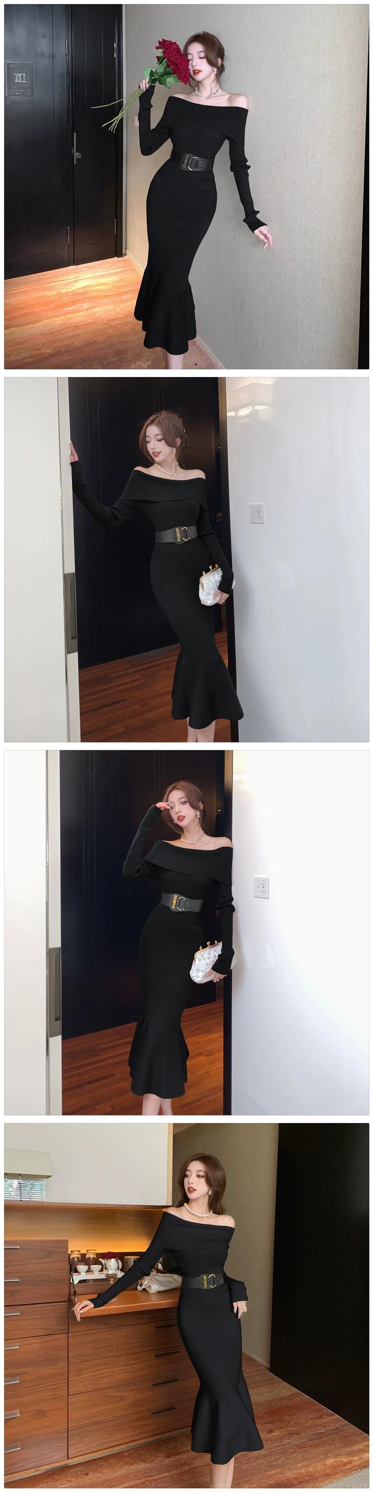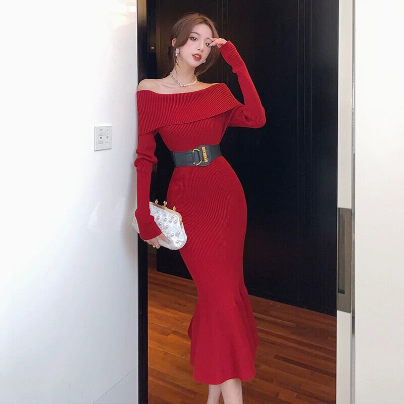 秋冬フレンチレトロハイエンドレディースコールドスタイル長袖ニットドレスウエスト痩身フィッシュテールセータードレス ロング オータム 秋物 ウィンター 冬物 yingd81886601437