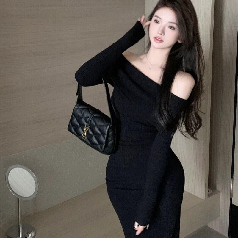 春の女性の 2023 新しいスタイルウエスト痩身とエレガントな女性のセクシーなワンショルダーチューブトップヒップカバーニットドレス スプリング 春物 yingd40116702996