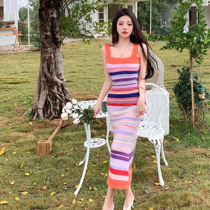 純粋な欲望スタイルセクシーなヒップカバーストライプニットサスペンダーロングスカート女性の夏のウエストティーブレイクフレンチニットドレス女性 サマー 夏物 yingd14904927139