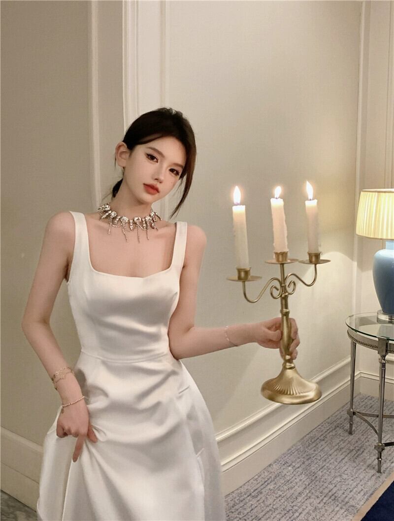 フランスの逃亡者プリンセス ホワイト サスペンダー ドレス ニッチ デザイン ウエスト A ライン サスペンダー ドレス Aライン yingd1927632606