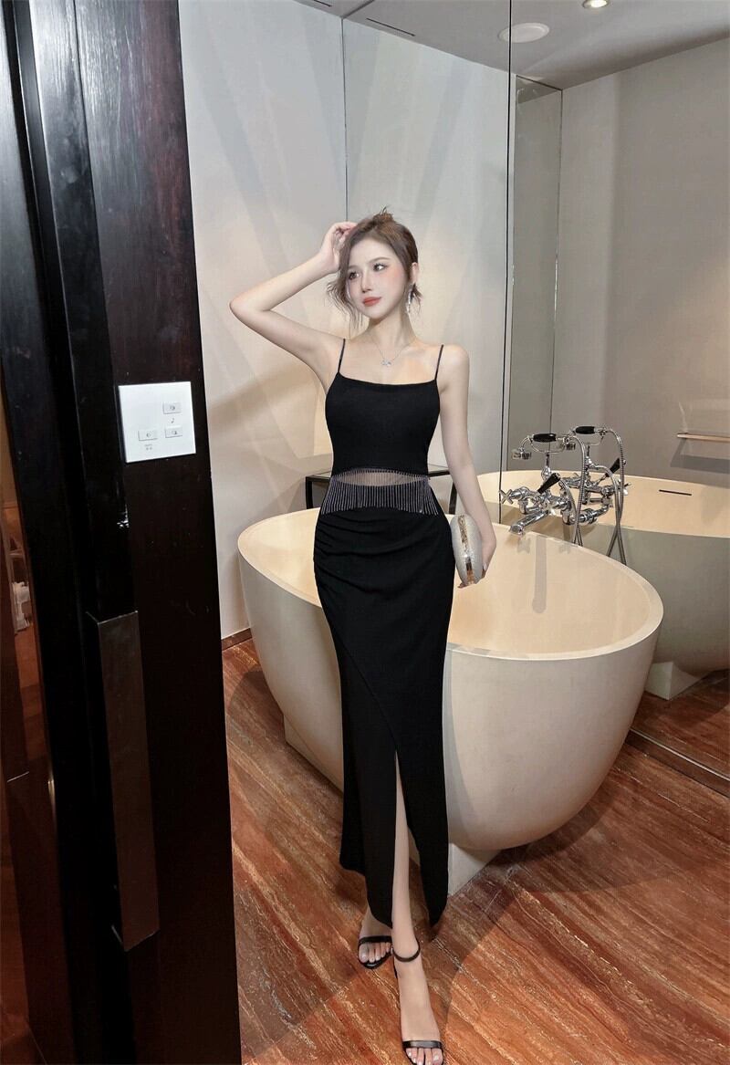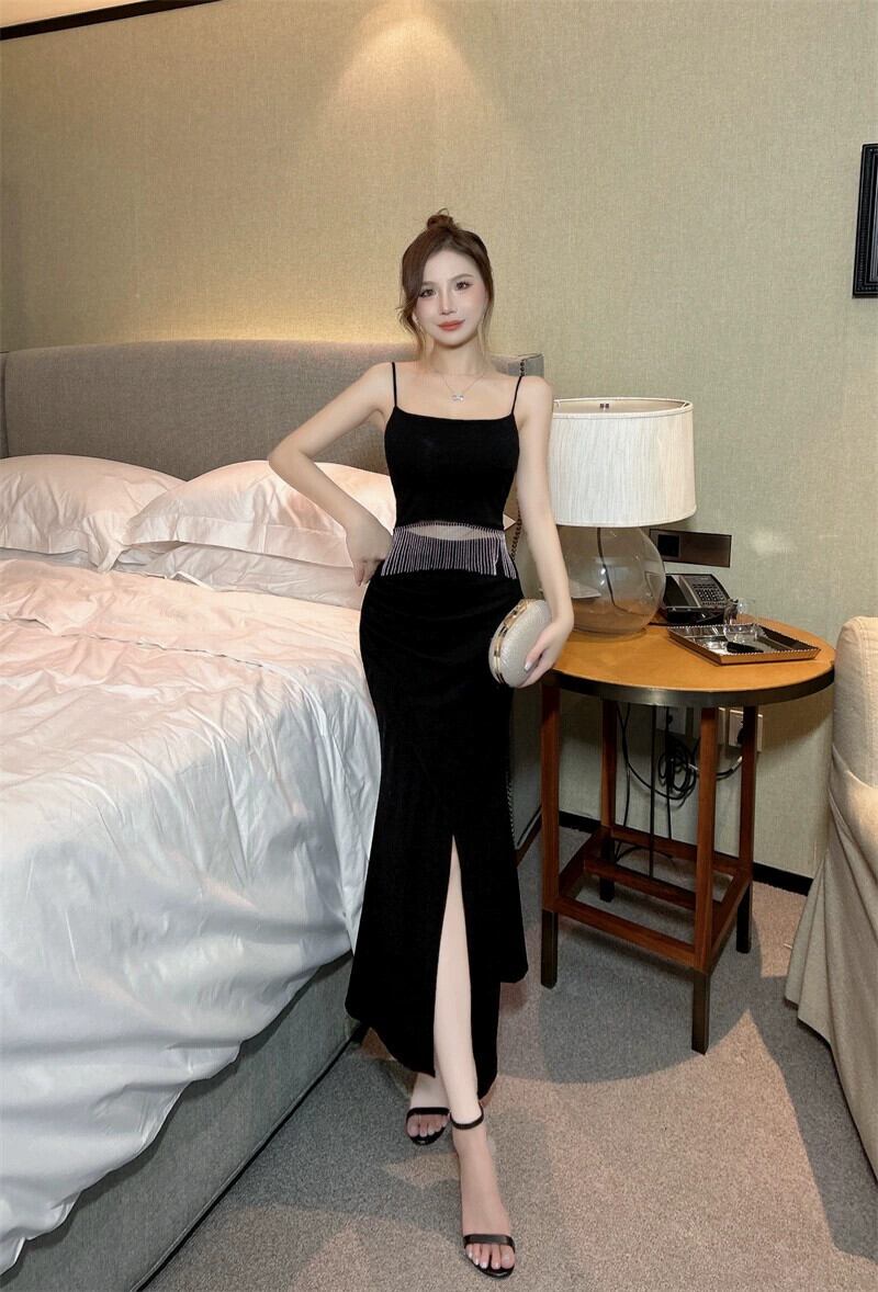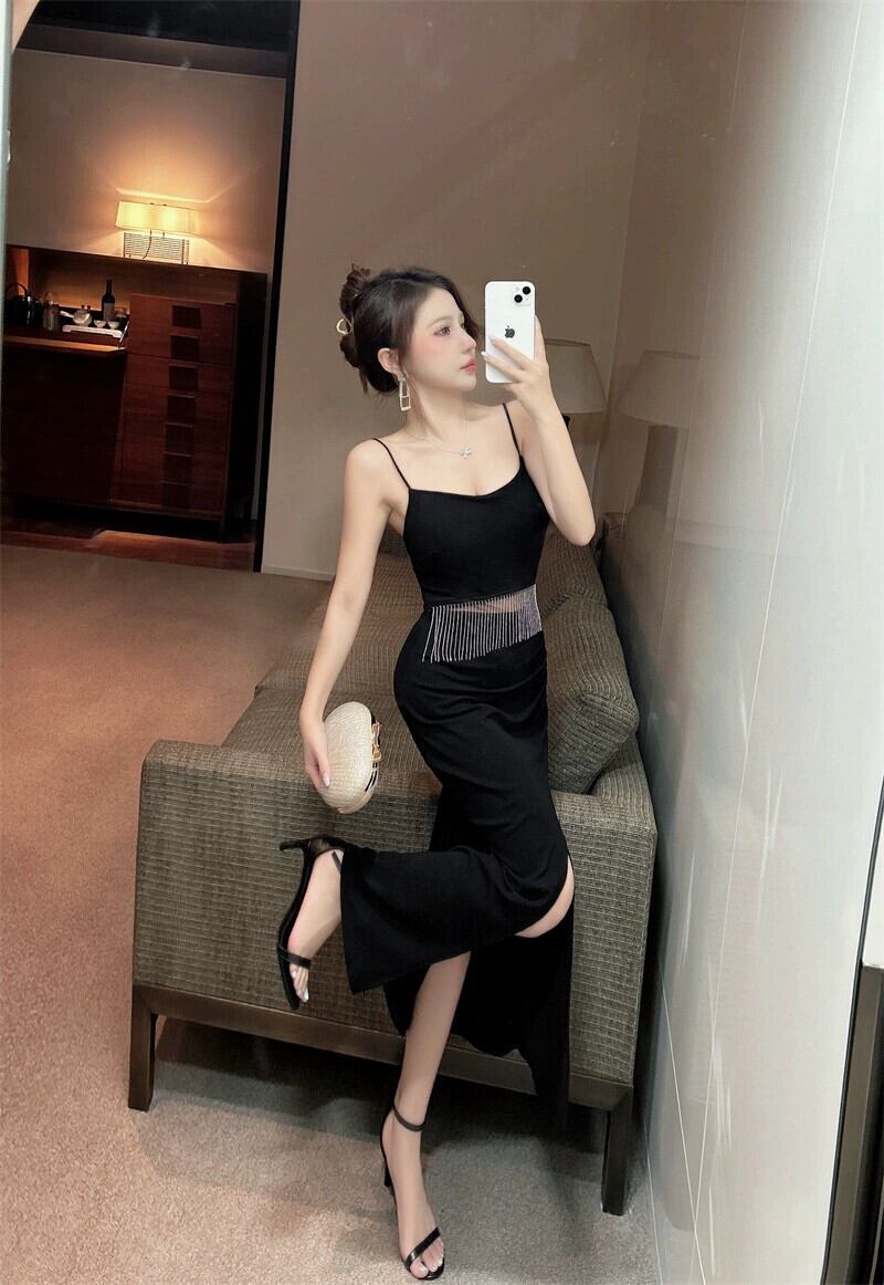 姉妹的なスタイルのリトルブラックドレスセクシーな露出ウエストテルサスペンダーロングスカートウエストスリットハイエンド絶妙なドレスの女性の夏 サマー 夏物 yingd18830183374
