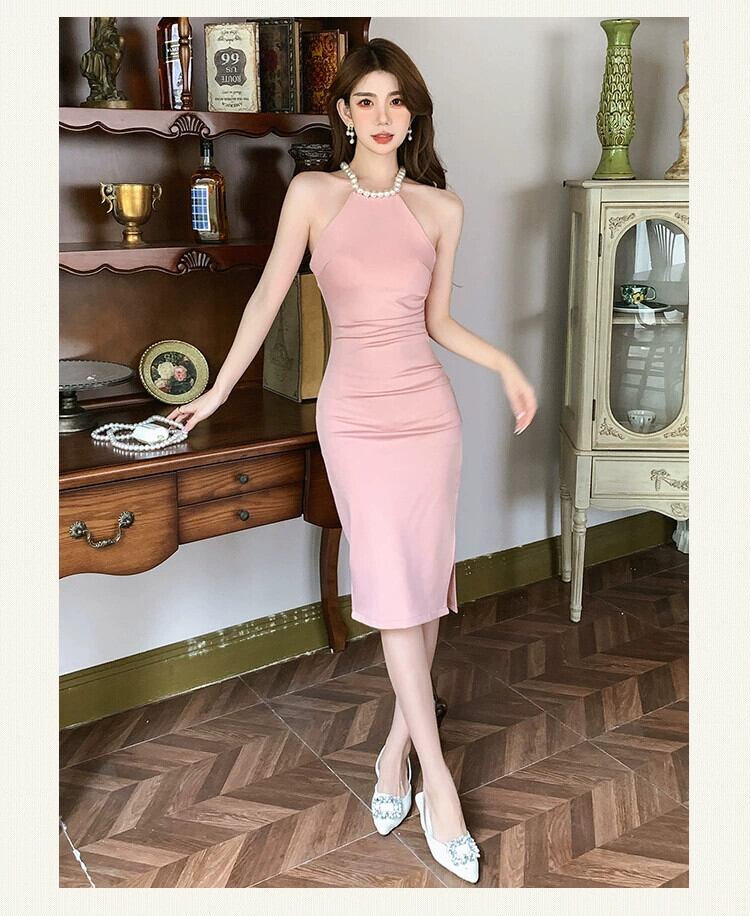 シックでユニークなニッチデザインのパールホルタードレス女性の夏クールロイヤルシスタースタイルスリムヒップラップサスペンダードレス サマー 夏物 真珠 yingd33635907452