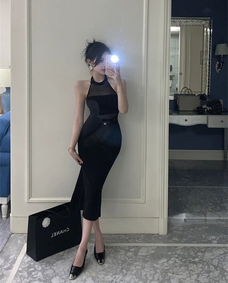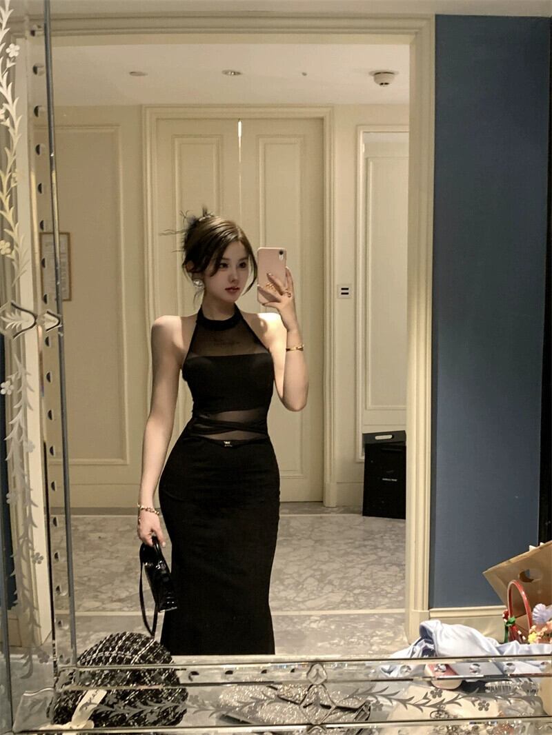クールロイヤルシスタースタイルセクシーな背中の開いたメッシュスプライシングスリムフィットヒップフィッシュテールホルタードレス 2023 女性の夏 サマー 夏物 yingd73190179954