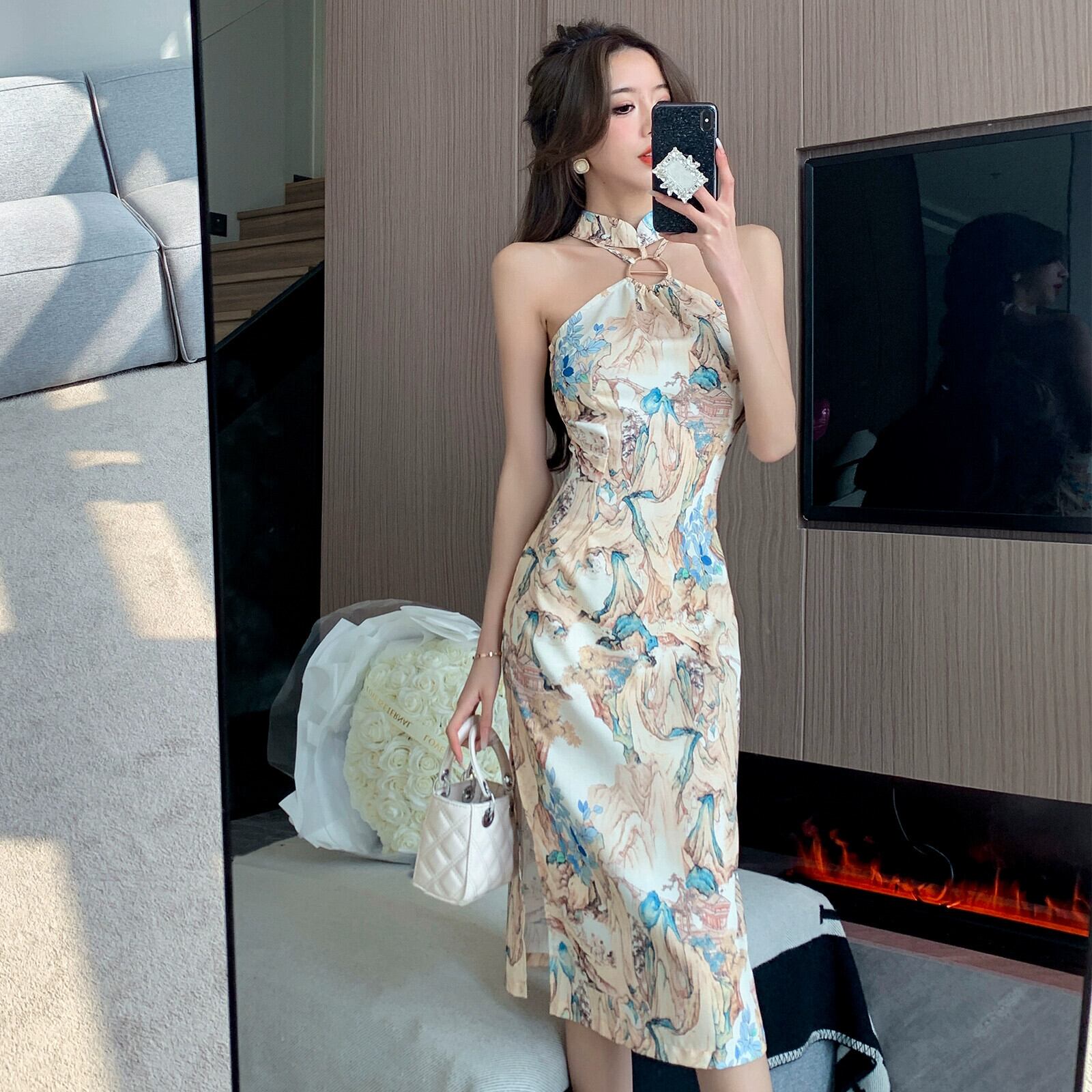中国風の婦人服 2023 新スタイルのホルターネック改良されたチャイナドレスレトロインクプリントハイエンドの絶妙なドレスの女性 yingd47284202618