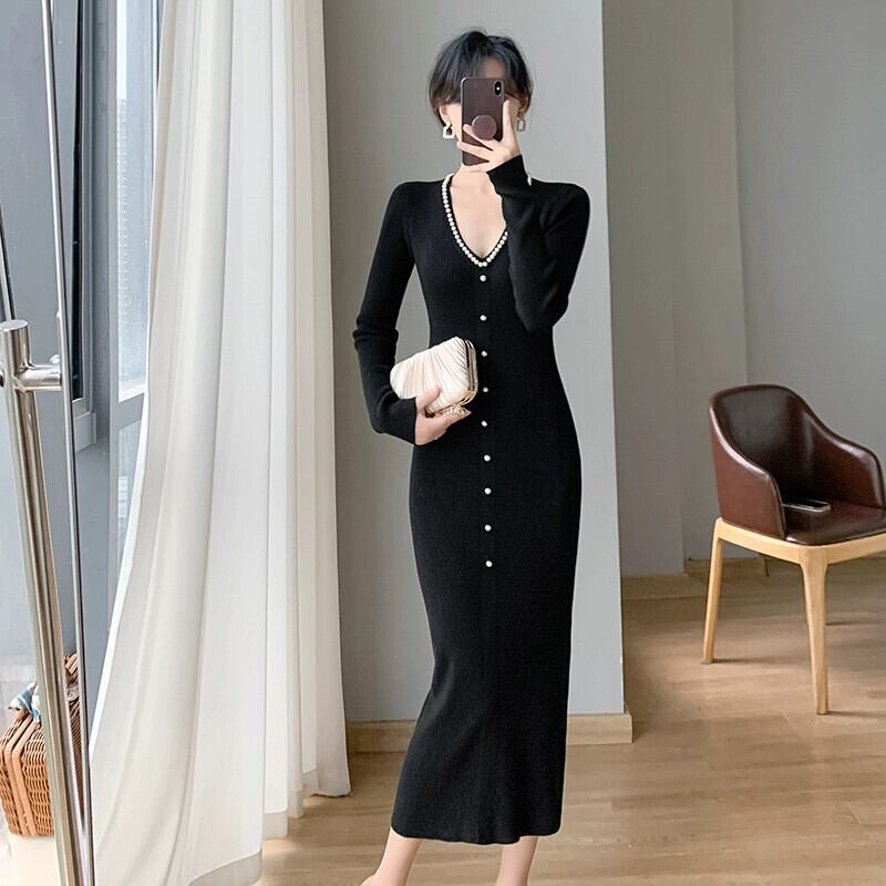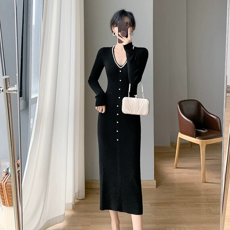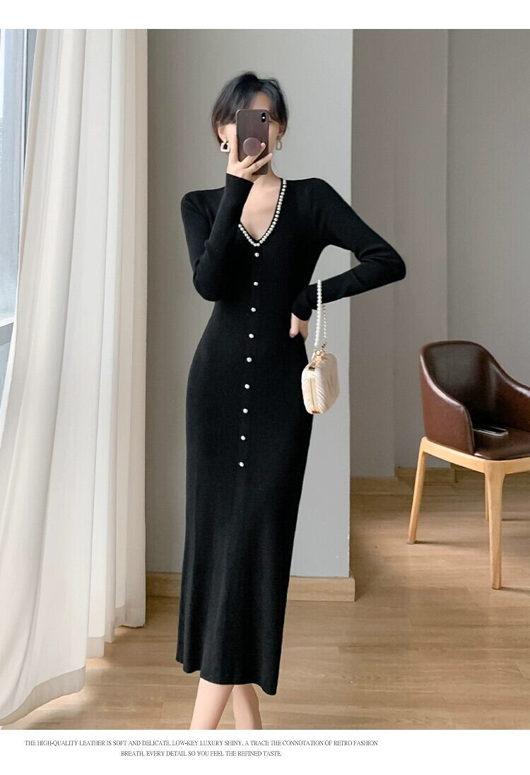 秋の女性の 2023 新しいスタイルのエレガントなリトルブラックドレススリムフィット V ネックヒップカバーインナーニットドレス オータム 秋物 Vネック yingd9049846506