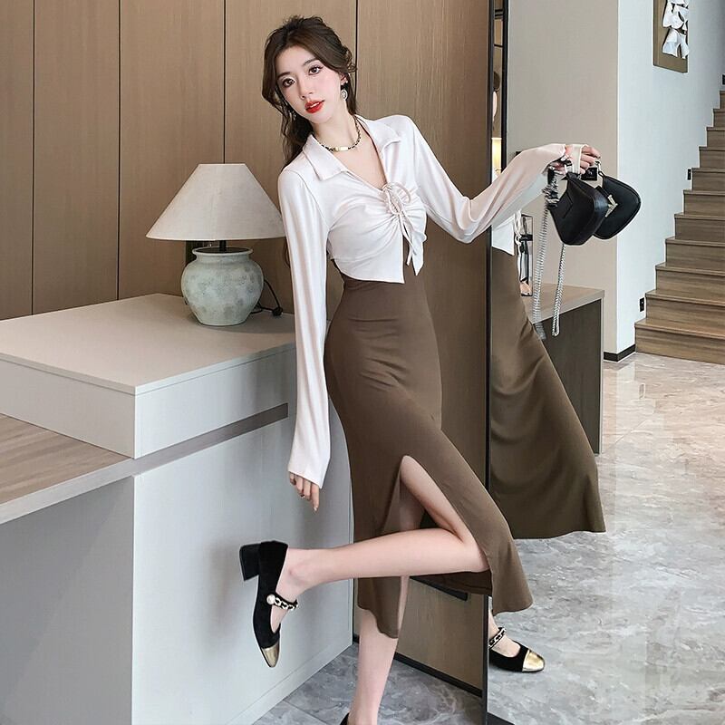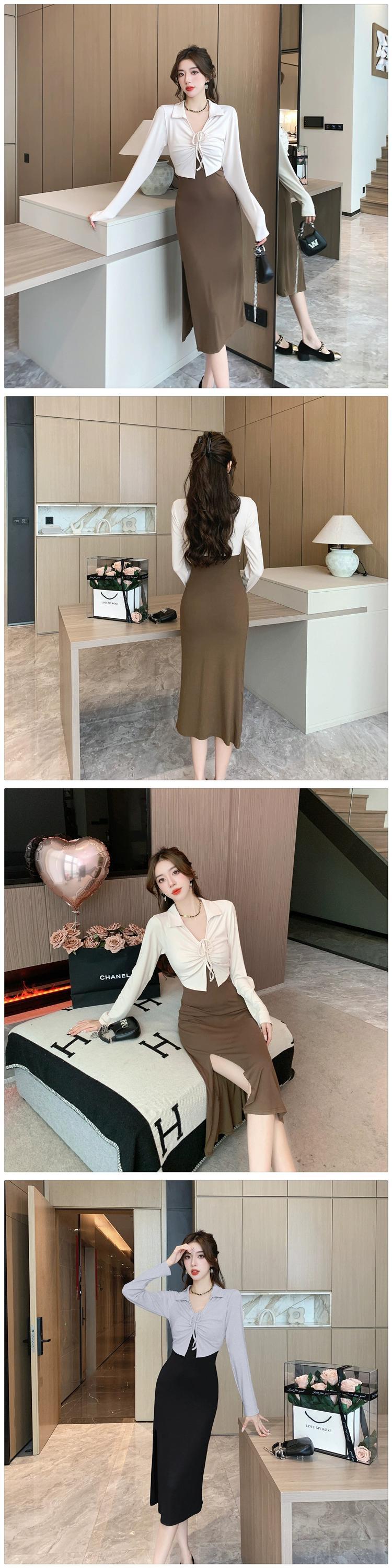 2023 秋の新作婦人服ユニークで超見栄えの良いハイエンドウエストバッグヒップスリットフェイクツーピース長袖ドレス ロング オータム 秋物 yingd72755162073