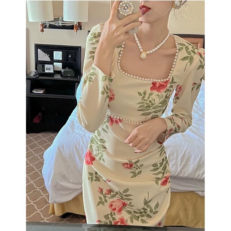 秋の女性の 2023 新しいスタイルの見事な小さなスカート、ハイエンドウエスト痩身長袖ドレープスクエアネックドレス ロング オータム 秋物 スクウェア yingd91095491939
