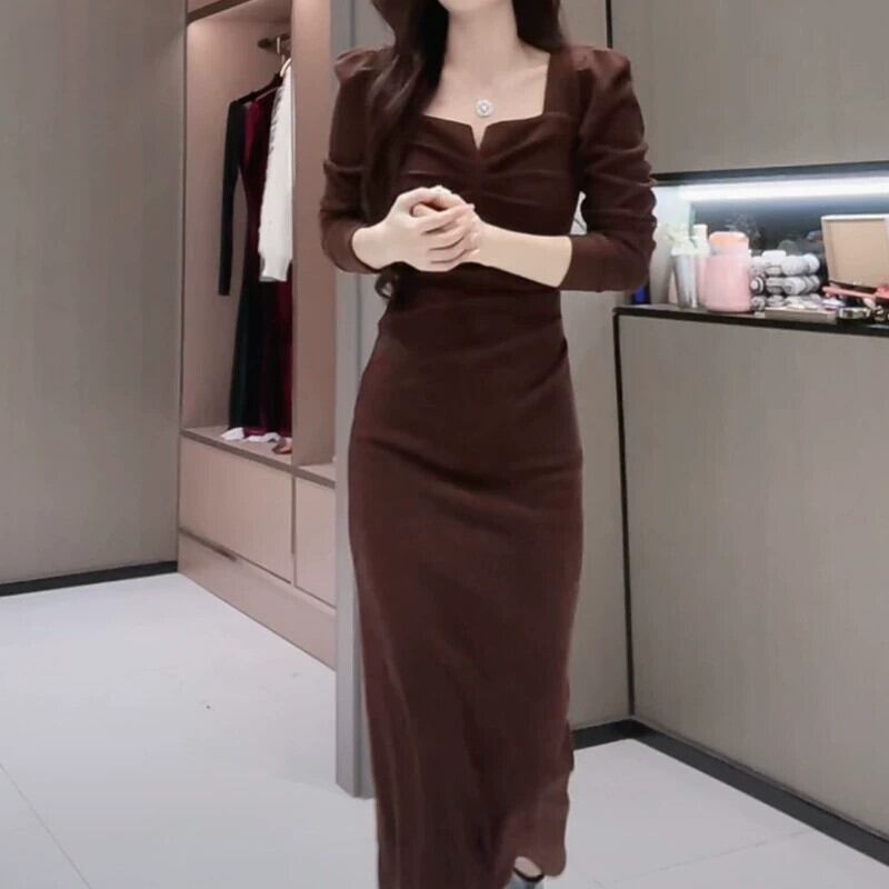 フレンチレトロスクエアネックパフスリーブスカート秋の女性のウエストプリーツ広州十三ライン女性の人気のドレス オータム 秋物 スクウェア yingd64279354388