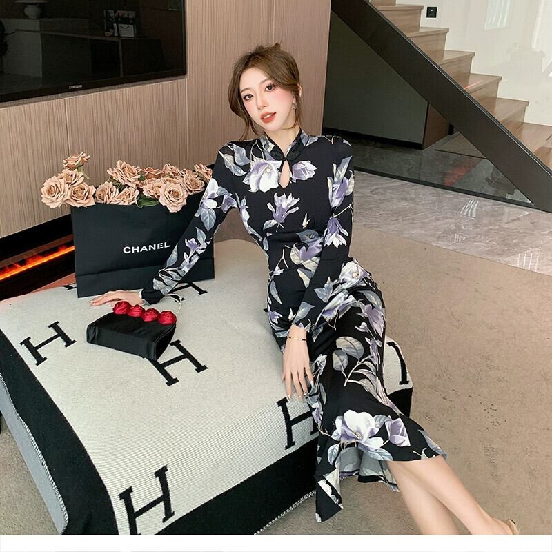 中国風の婦人服レトロライト国民風改善チャイナドレスウエスト痩身気質ヒップハグフィッシュテールプリントドレス女性 yingd97230121497