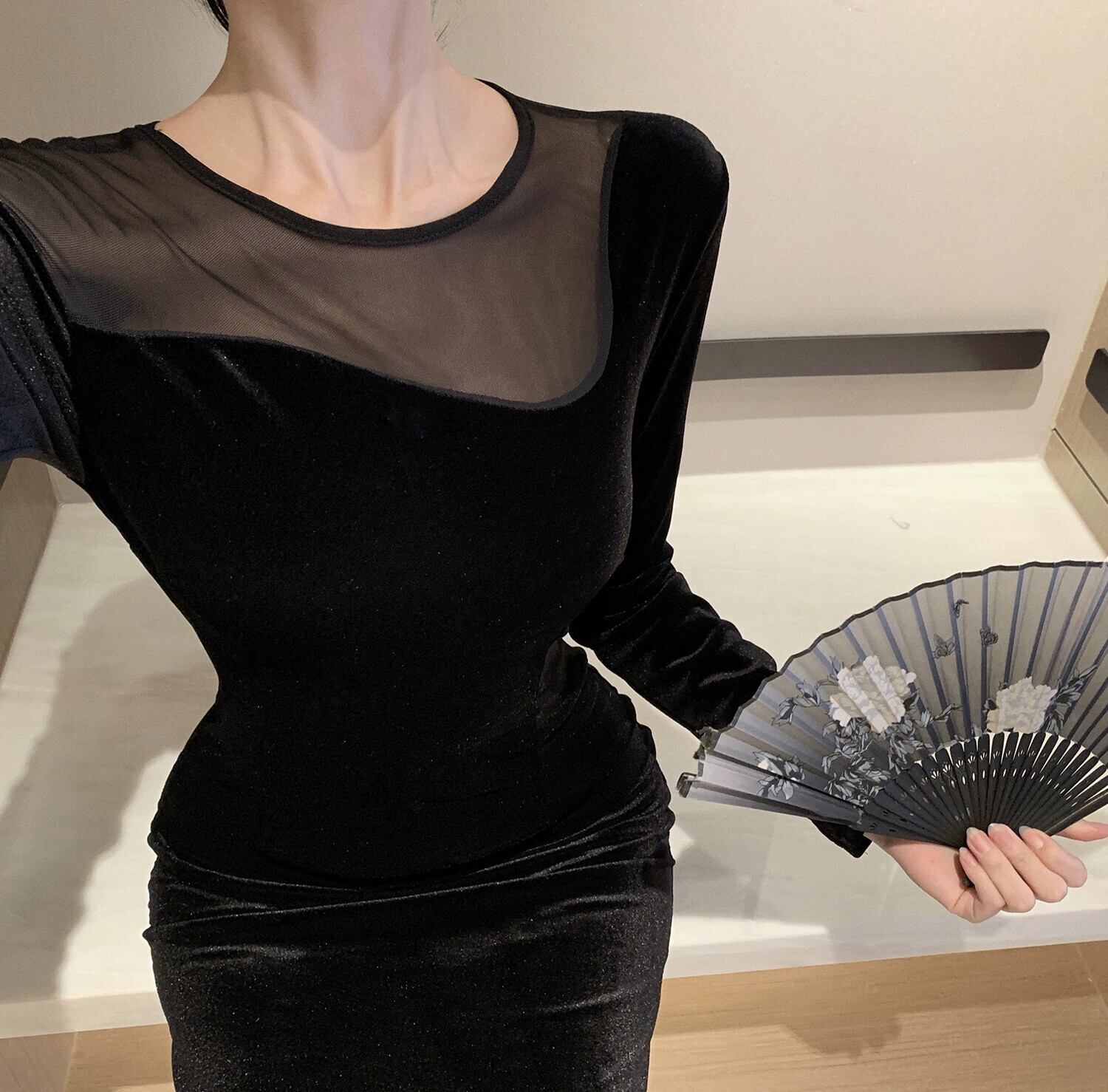 -エンド婦人服、ライトラグジュアリー、フェミニンメッシュ、ベルベット長袖スリムドレス、秋冬フレンチロングスカート オータム 秋物 ウィンター 冬物 yingd10231448819