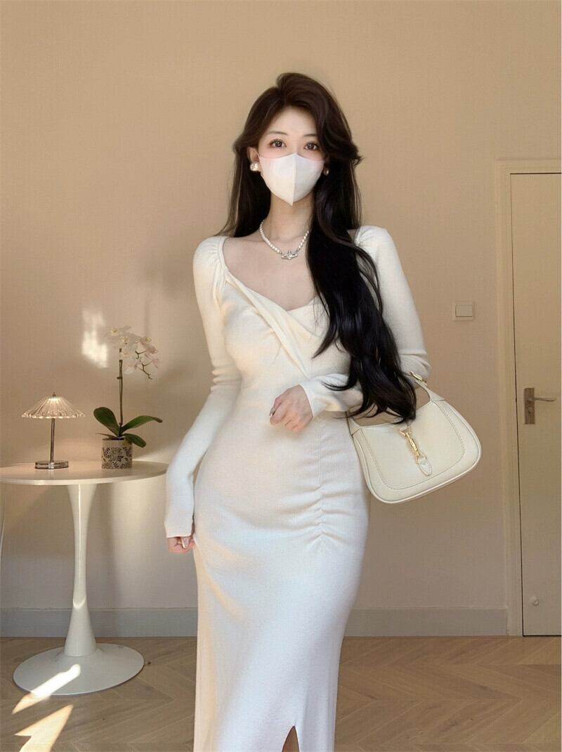 秋冬フレンチロングスカートニッチで美しい小さなスカートハイエンドウエスト痩身ツイストビッグウールニットドレス オータム 秋物 ウィンター 冬物 yingd45500419041