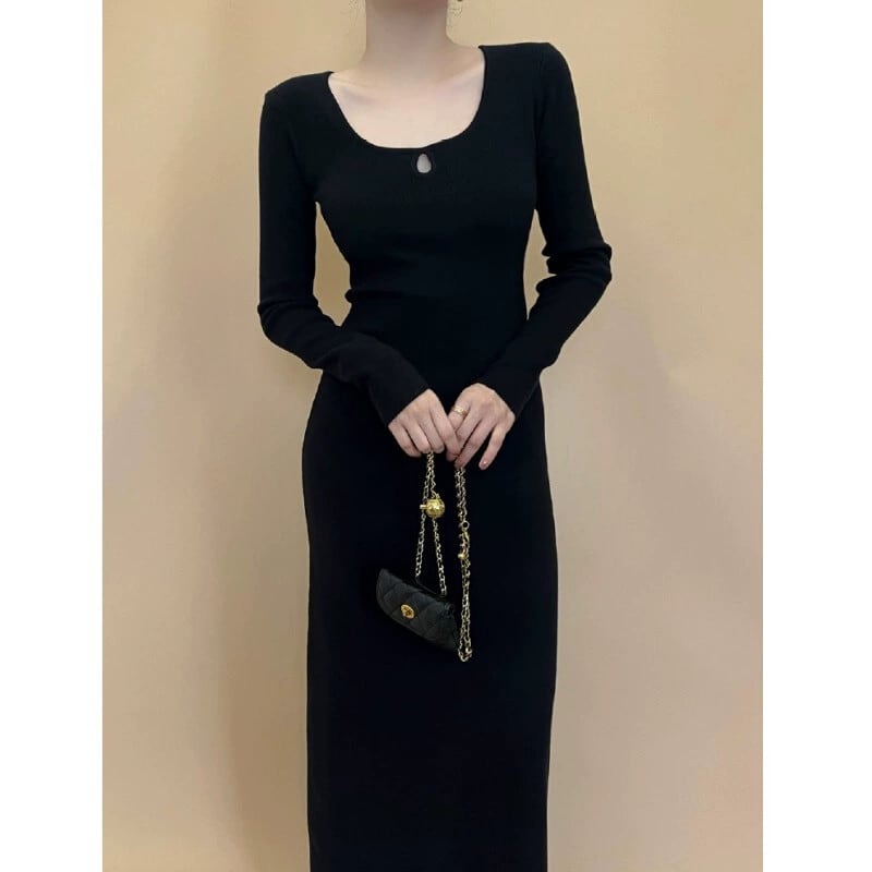 フランスのレトロなヘップバーンスタイルの黒のロングスカート、ハイエンドのウエストと痩身気質の長袖冬のインナードレスの女性 ブラック ウィンター 冬物 yingd8046053149