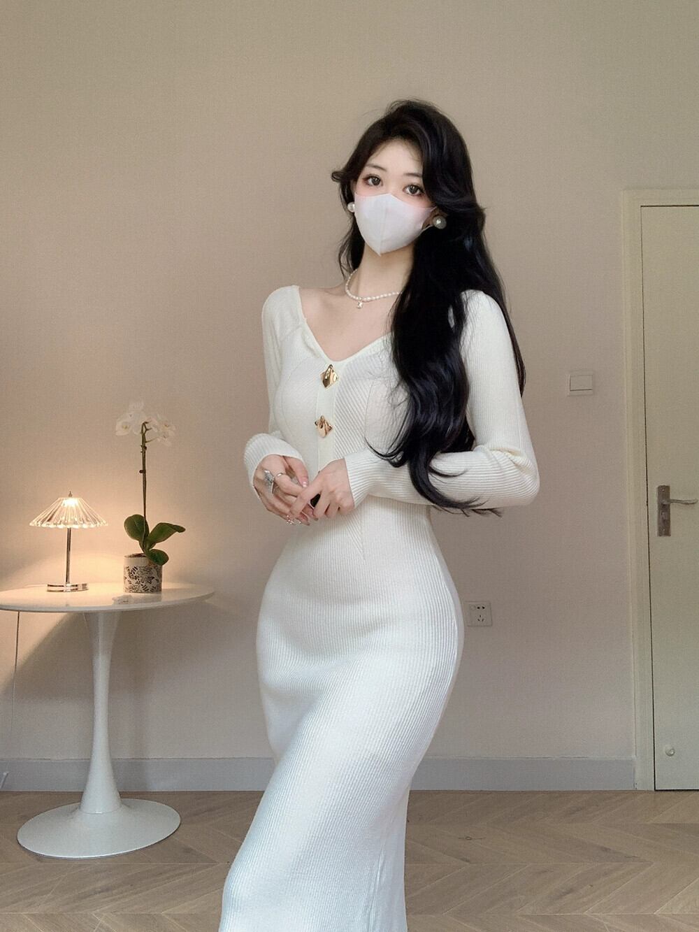ロングセータースカート、下にコート付き、膝上ウエスト、長袖スクエアネックニットドレス 2024 新しい女性の秋冬 オータム 秋物 ウィンター 冬物 スクウェア yingd85839919291