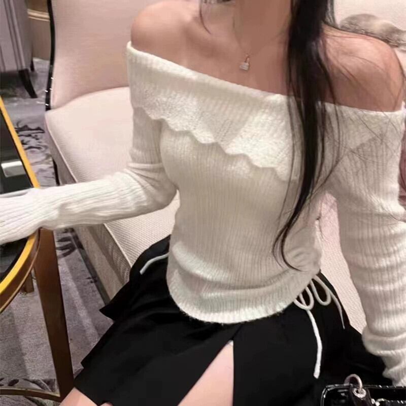 ワンショルダー怠惰なソフトもちオフショルダーセーター女性秋と冬のルーズデザイン長袖スクエアネックボトリングシャツニットトップ ロング オータム 秋物 ウィンター 冬物 スクウェア yingd36743040960