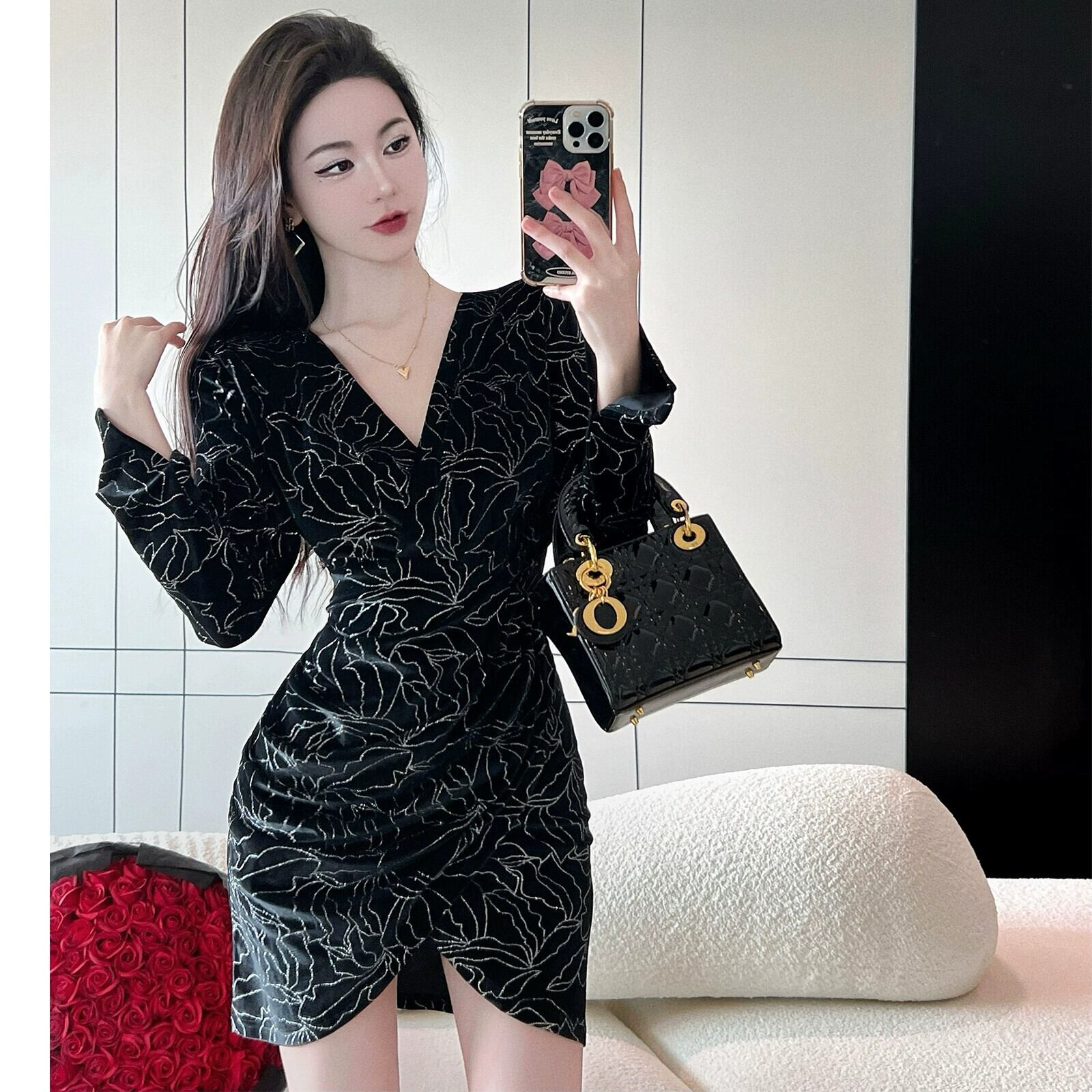 秋の女性の 2024 新しいニッチ美しい小さなスカートハイエンド V ネックレトロベルベット成熟したシスタードレス オータム 秋物 Vネック yingd52858445802
