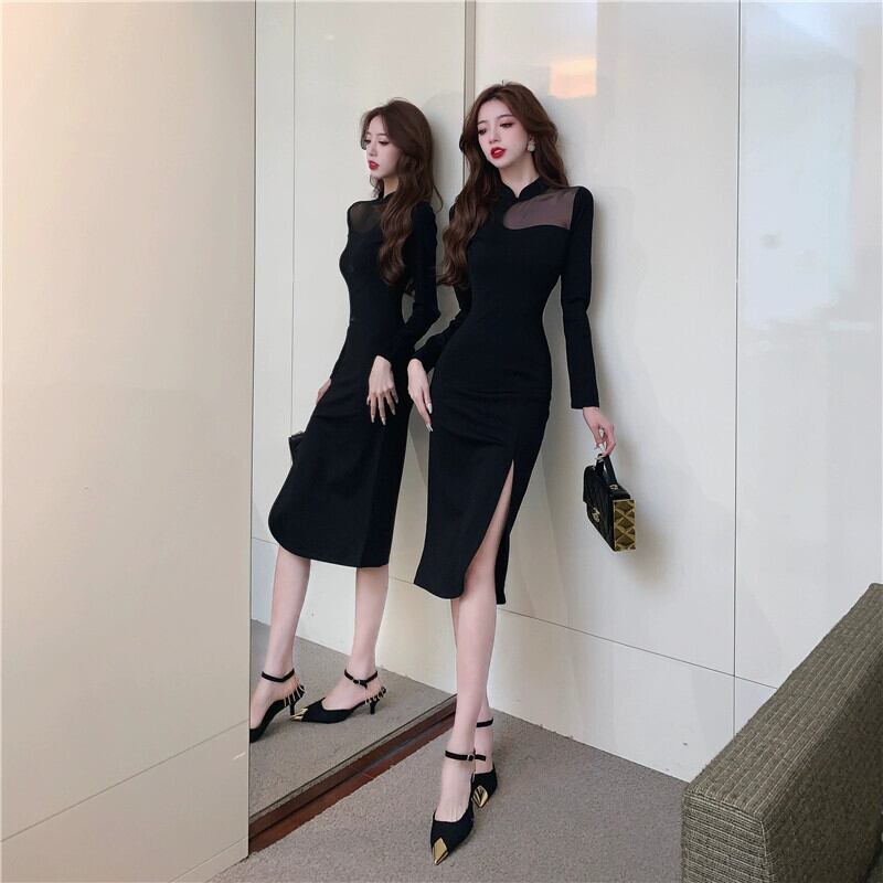 中国風のロイヤルシスターライト成熟したスタイルのデザインメッシュ中空セクシーなスリット改良されたチャイナドレス秋と冬の女性 オータム 秋物 ウィンター 冬物 yingd7406090361