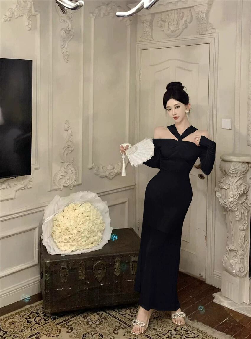秋冬フレンチロングスカート、ウエストスリム、ユニークでユニークなデザイン、オフショルダーホルターネックドレス2024新しいスタイル オータム 秋物 ウィンター 冬物 yingd48866108730