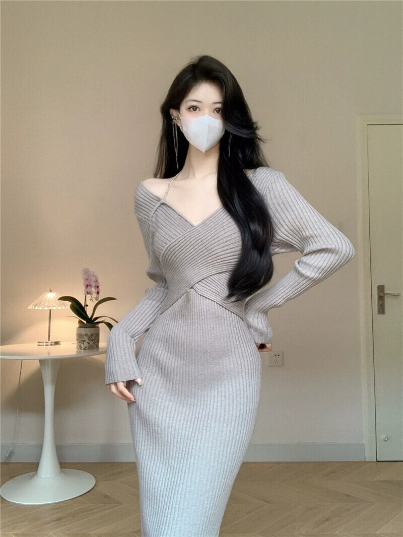 女性の秋と冬のミドル丈のホルターネックスプライシングチェーン長袖ボトムニットドレス、コートとインナーセータースカート付き ロング オータム 秋物 ウィンター 冬物 yingd8908678432