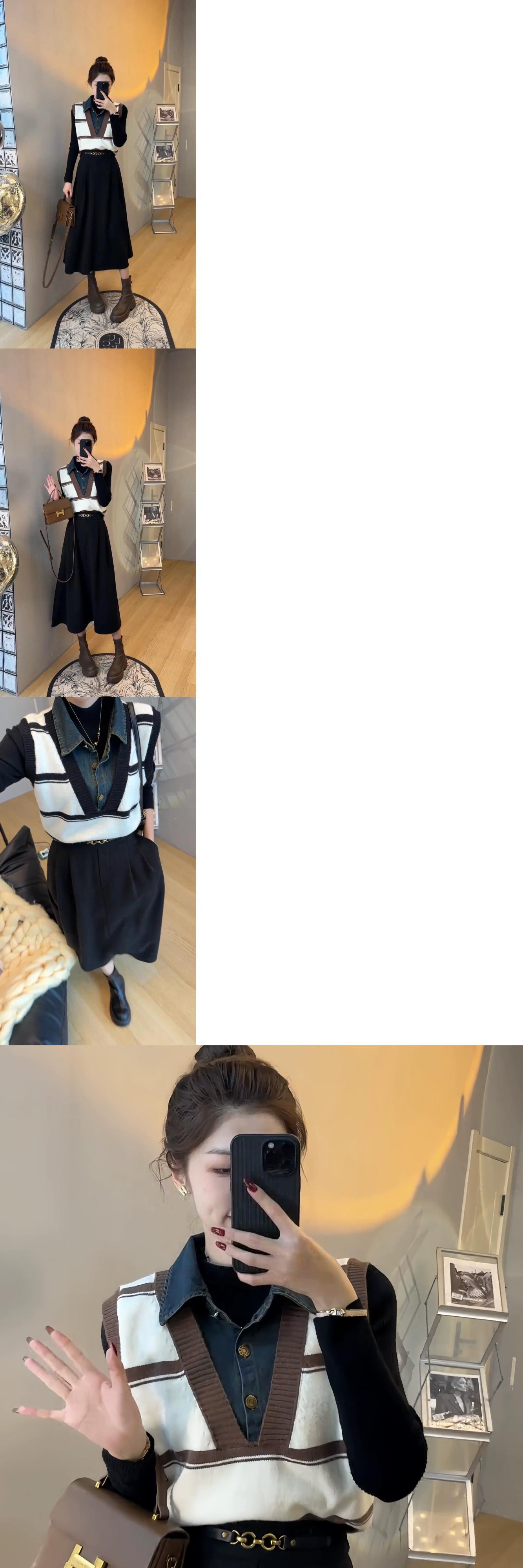 エドデニムスプライシングニットベストトップ、ハイエンドで超見栄えの良いセーターの女性、2024新しい秋冬 オータム 秋物 ウィンター 冬物 yingd6023295802